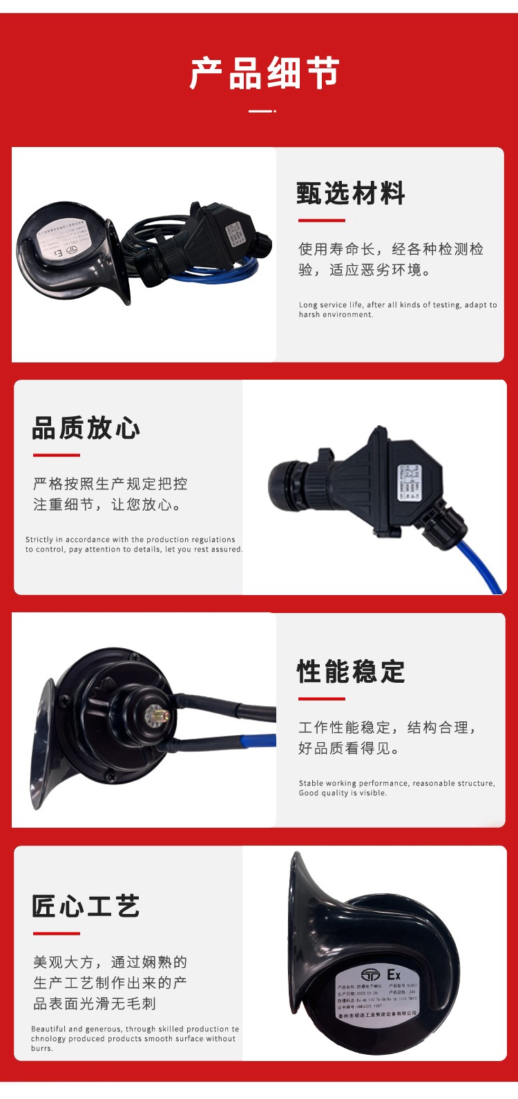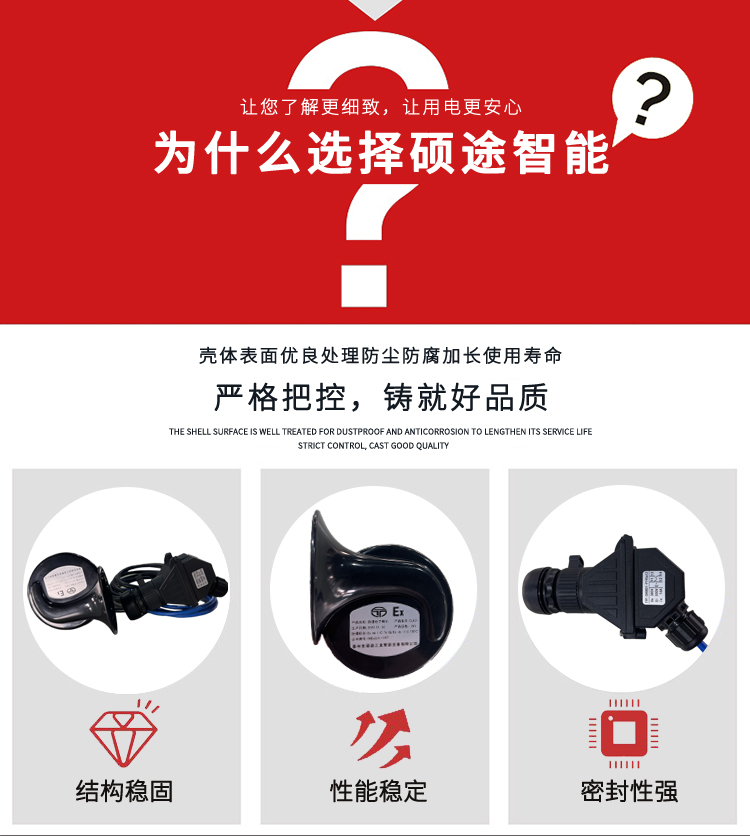 根据电压的要求,装配不同电压的喇叭。防爆电子喇叭均具有外形美观、声级强度大、噪音小、传输距离远、经久耐用、防爆性能好的优点,适宜在含有瓦斯或煤尘爆炸危险的煤矿井下及其他危险场所中使用。